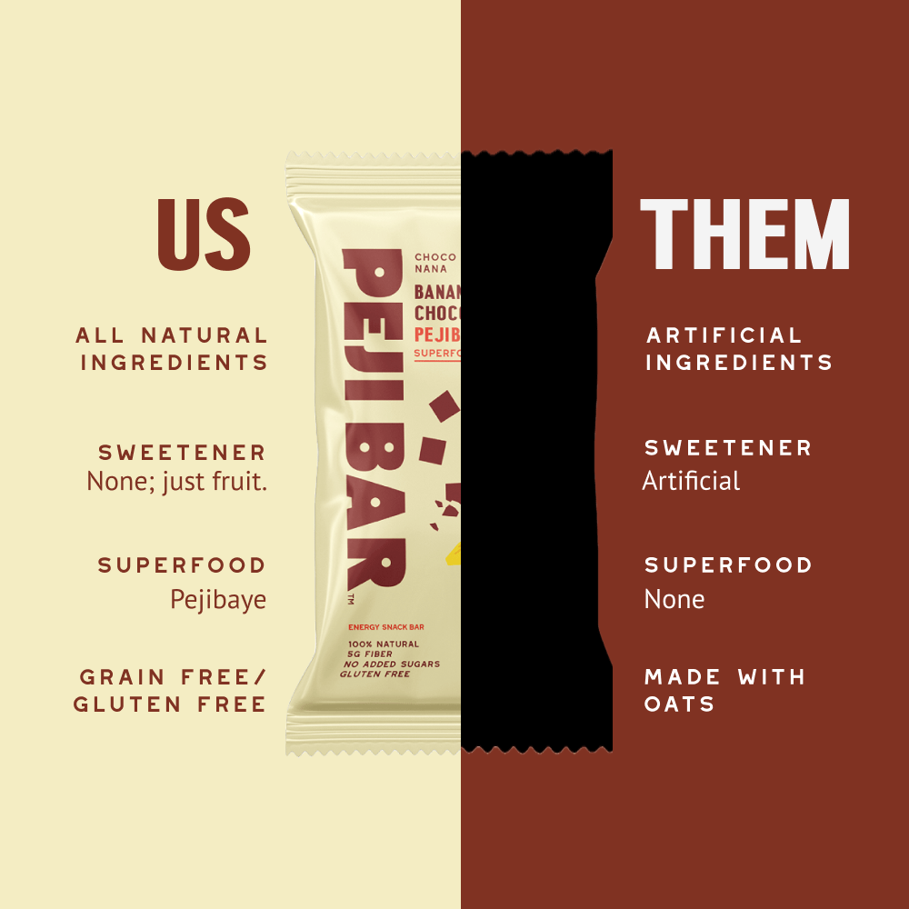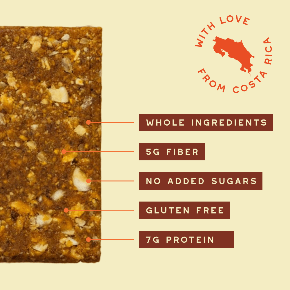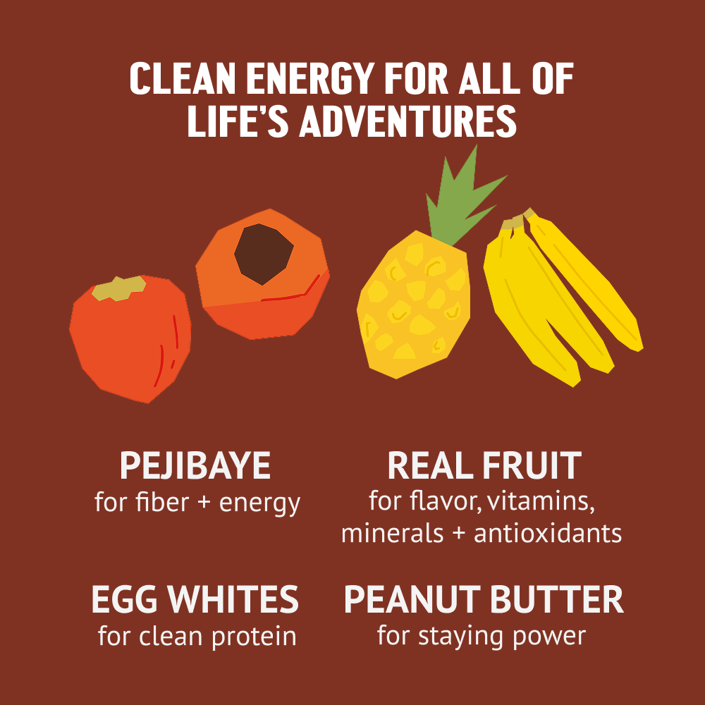 Ingredients: Dried banana, pejibaye flour, unsalted peanut butter, pineapple chips, powdered egg whites, unsweetened chocolate, water.