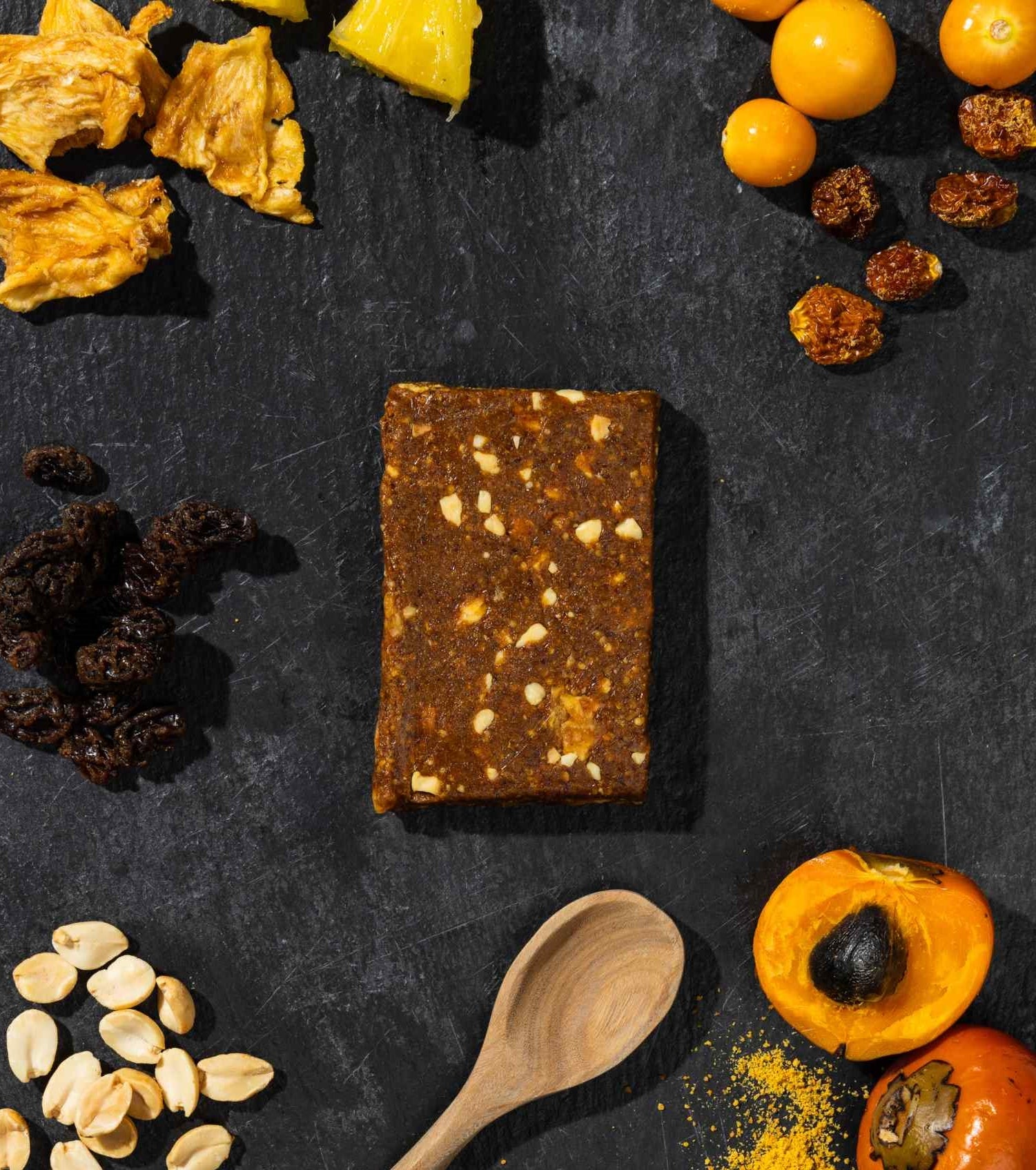 Ingredients: Raisins, dried golden berries, pejibaye flour, unsalted peanut butter, powdered egg whites, pineapple chips, peanuts, water.
