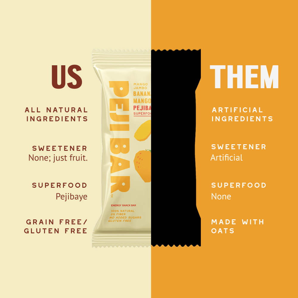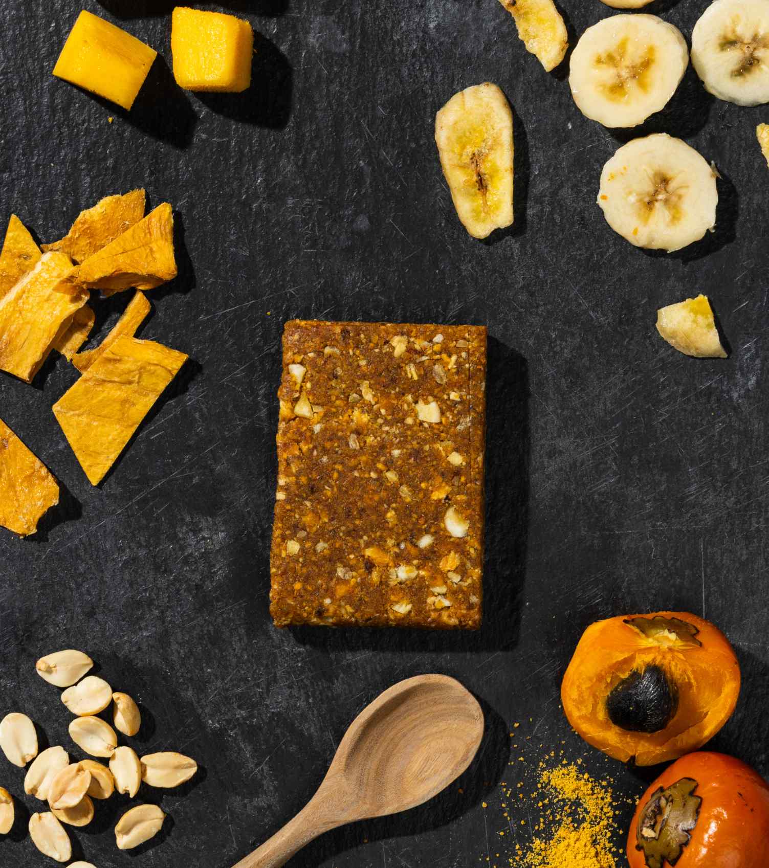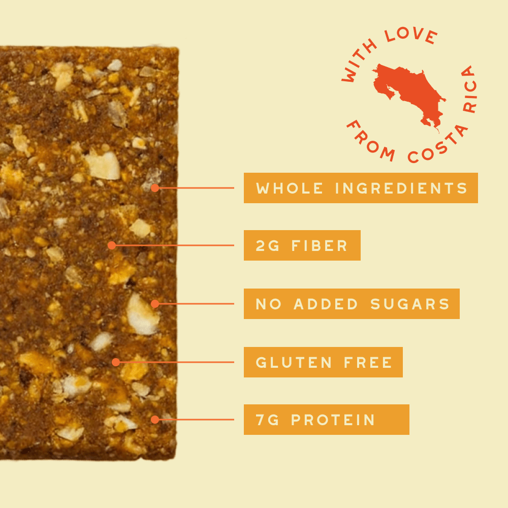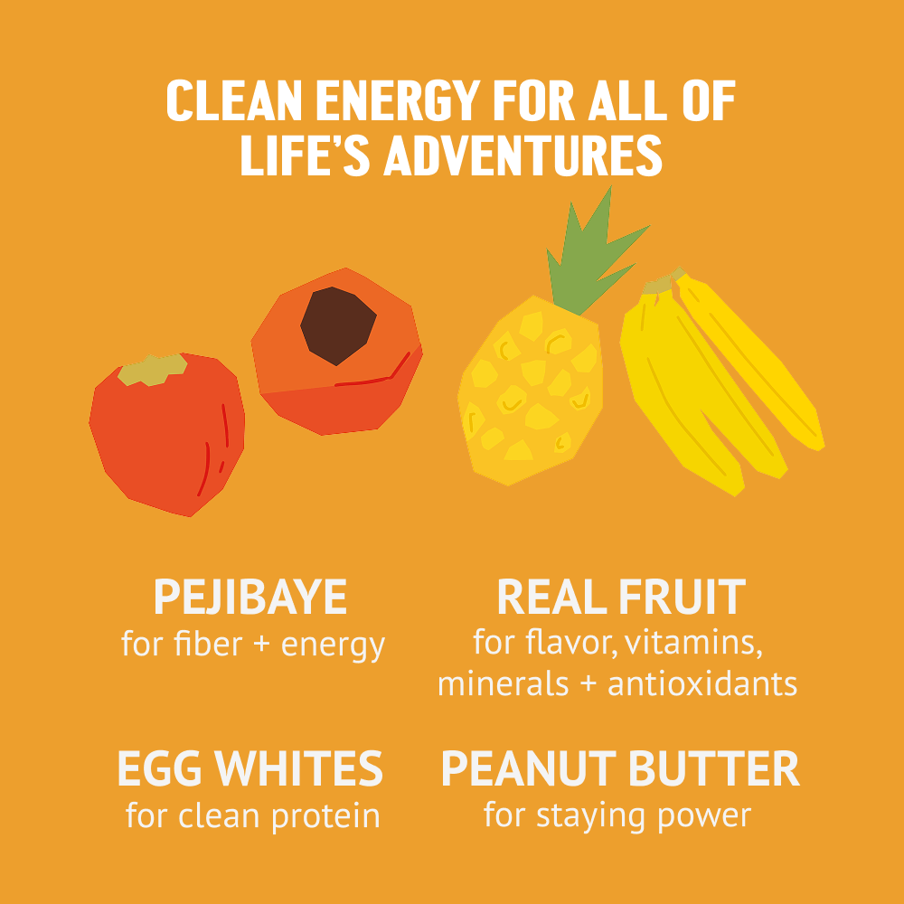 Ingredients: Dried mango, dried banana, pejibaye flour, pineapple chips, unsalted peanut butter, powdered egg whites, and water.