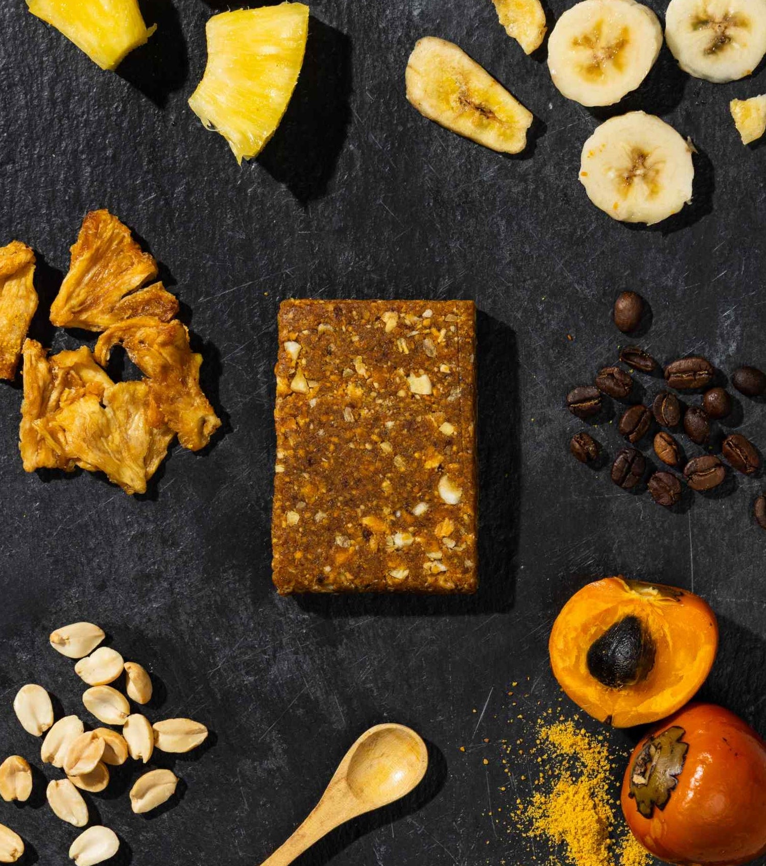 Ingredients: Dried banana, dried pineapple, pejibaye flour, unsalted peanut butter, banana chips, powdered egg whites, and Costa Rican coffee.